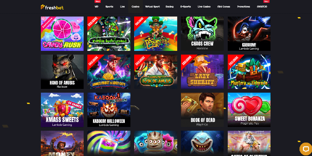 Starting in 2021, users will have access to a plethora of gaming options at FreshBet, a completely crypto online casino. Hundreds of odds on more than 20 sports are available at the sportsbook, which is part of an enormous library with over 3300 goods including slots, several poker, blackjack, and roulette variants, and more. A huge, interactive banner advertising the many gaming sections and current promotions is part of the website's contemporary, streamlined design that features high-quality visuals.