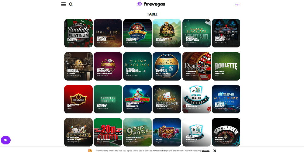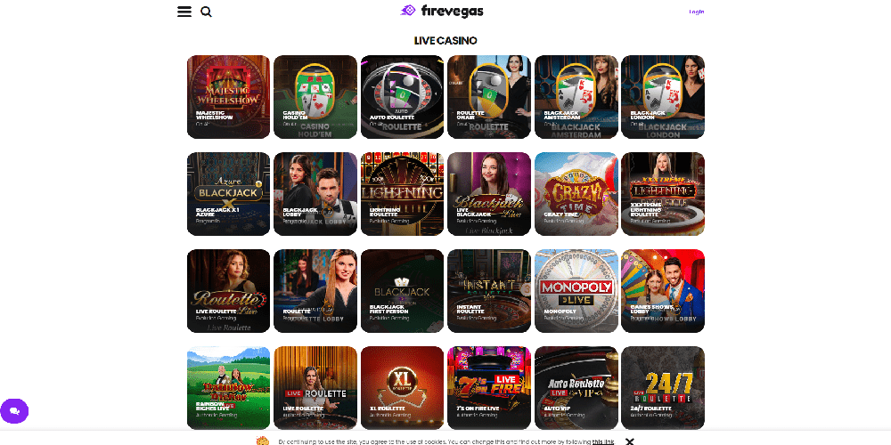 With a wide variety of slot machines and a plethora of card and table games available in both virtual and live formats, FireVegas boasts an excellent game selection. Blackjack (both European and American), Roulette (both European and American), Craps, Sic Bo, Baccarat, Texas Hold 'Em, Three Card Poker, Dragon Tiger, Crazy Time, Monopoly Live, and many more games are available.